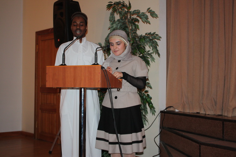 Ведущие вечера студентка 2 курса Залха Базарова и студент 5 курса Али Мухаммад Али из Кении начали мероприятие со слов приветствия «Ассаляму Алейкум ва рахматуЛлахи ва баракятух». Их обращение к зрительному залу дублировалось на двух языках - английском и русском.