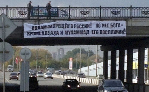 В Калининском районе города на перекрестке Свердловского проспекта и улицы Братьев Кашириных появились растяжки «Нет бога кроме Аллаха и Мухаммед его посланник!» и «Мусульмане! Нас 20 млн в России, а наш Коран запрещен!».