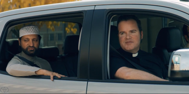 Сначала раввин садится за руль пикапа Toyota Tundra и спешит к церкви, откуда выбегает священник, тоже опаздывающий на финальный матч. Оттуда они едут к мечети и забирают имама в тюбетейке и религиозном одеянии. Наконец, к ним подсаживается буддийский монах в традиционной рясе, передает AdAge.