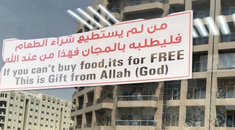 На витрине ресторана возле Mall of the Emirаtes написана фраза на арабском и английском языках: «Если вы не можете оплатить еду, она для вас бесплатна. Это подарок от Аллаха».
