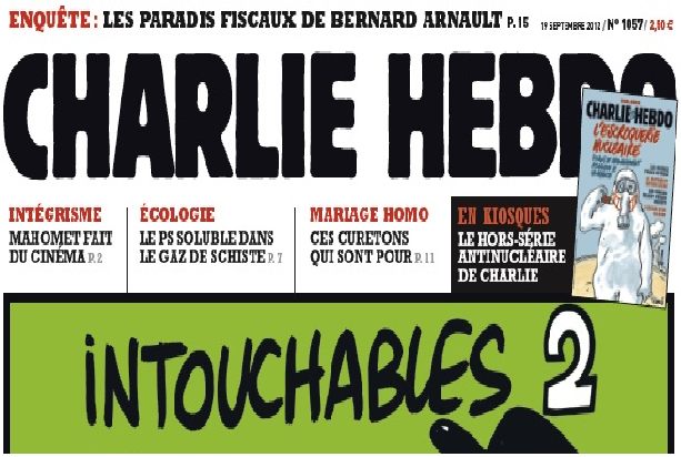 На обложке газеты изображен мусульманин в инвалидном кресле, которое везет иудей. Инвалид произносит фразу "Ничего смешного". Иллюстрация озаглавлена "Неприкасаемые 2" и является пародией на популярный во Франции фильм "Неприкасаемые" режиссеров Эрика Толедано и Оливье Накаша об инвалиде-аристократе и его темнокожем помощнике. Изображения внутри газеты более вызывающие. На некоторых из них пророк Мухаммад (мир ему) изображен обнаженным (!).